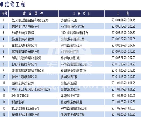 宏顺建设工程有限公司是国家批准成立的专业高空作业企业:承揽过(国内.国外)烟囱新建、烟囱防腐、砖烟囱新建、烟囱改造、烟囱维修、烟囱脱硫防腐、烟囱拆除加高、烟囱滑膜等高空作业工程。具有“不搭脚手架 、 不需要停产”施工特点。